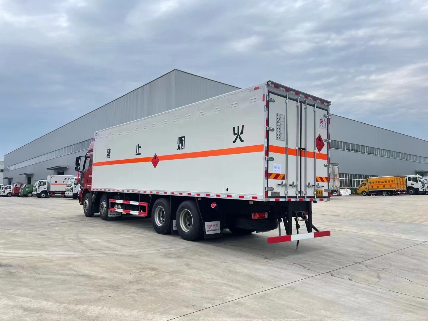 嚴格按照公告尺寸制作。外板采用烤漆板帶百葉窗,內飾為導電性能良好的鋁平板有透氣孔,矩形骨架結構內部填充防火阻燃材料,復合加鉚合工藝。廂體四周鋁合金包邊及包角,車廂底板4mm鋪設防靜電膠皮,廂體前臉50公分高鋪設防靜電膠皮。后部設置對開門,右側一組雙開門,廂體內部兩側安裝捆綁貨物的臥環。廂體內部安裝煙霧報**器及防盜報**感應器。車廂一周粘貼橙色反光帶,箱體粘貼 菱形標志牌,安全告示牌,危險品牌,箱體安裝示廓燈(前白后紅),拖地靜電帶。